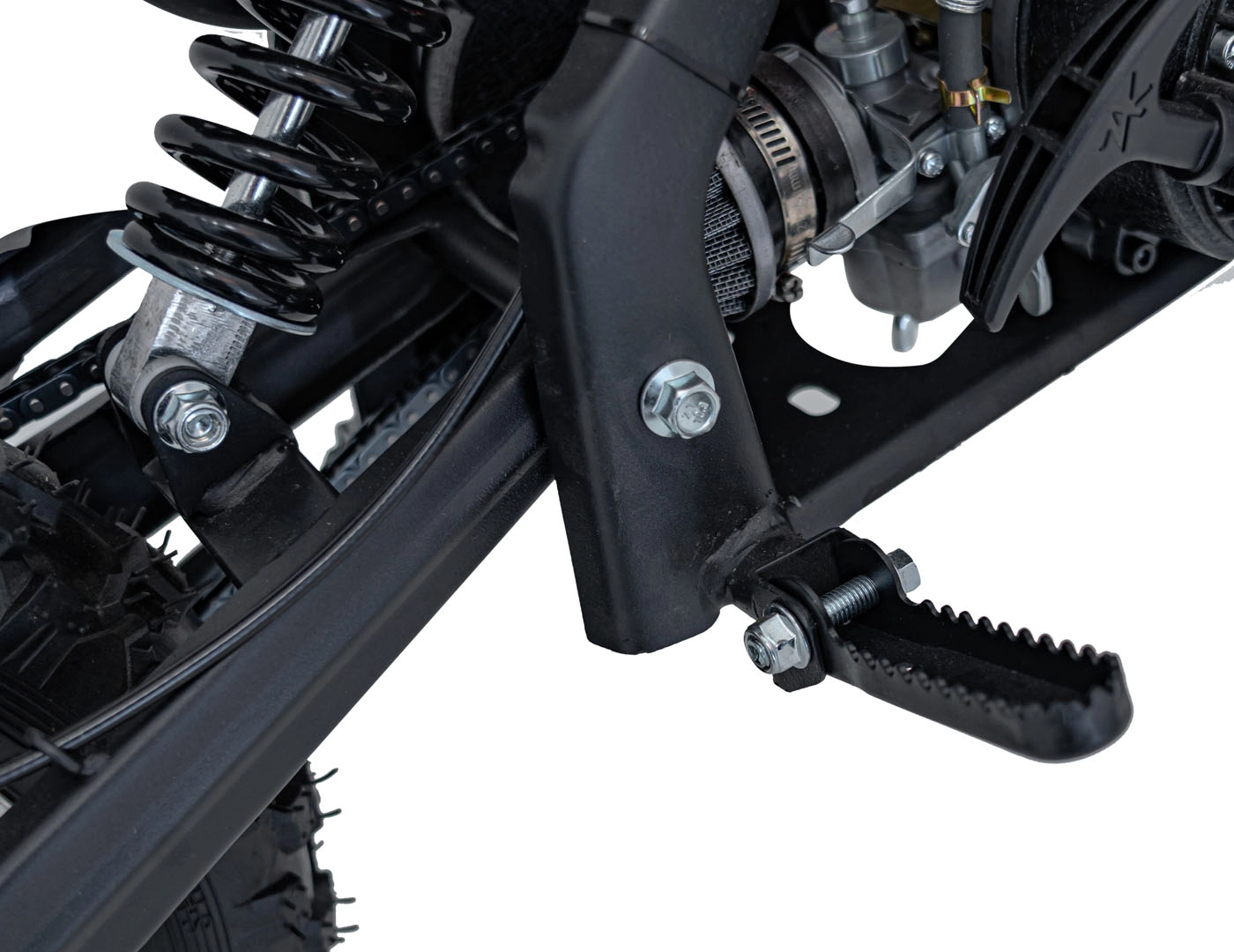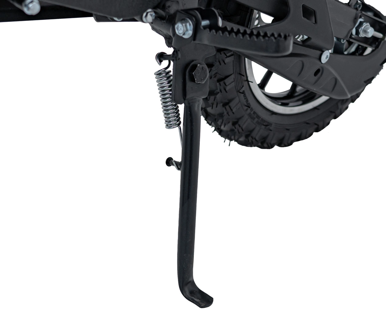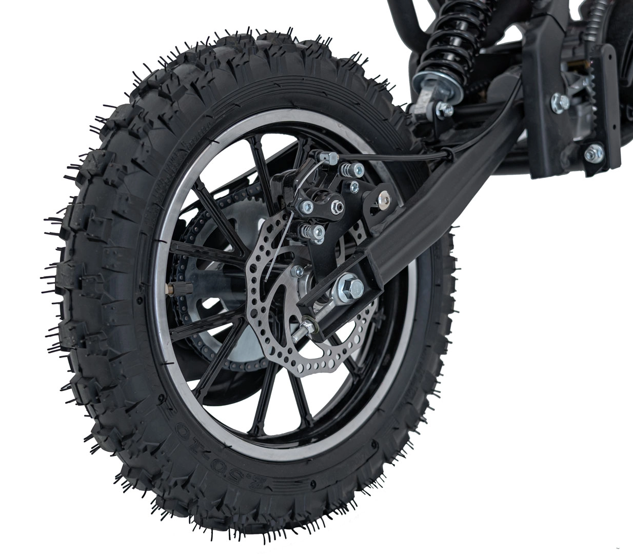 Kompaktný benzínový mini motocykel STORM s motorom 49 ccm ponúka skvelú zábavu pre začiatočníkov aj pokročilých. Má pevný oceľový rám s práškovou povrchovou úpravou, kotúčové brzdy vpredu aj vzadu, teleskopickú vidlicu a nafukovacie pneumatiky s hlbokým dezénom pre istý záber v teréne. Štartovanie je ručným štartérom a bezpečnosť zvyšuje bezpečnostná trhacia šnúra pre okamžité vypnutie.