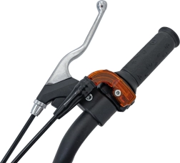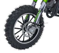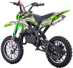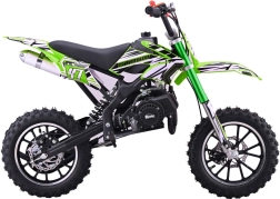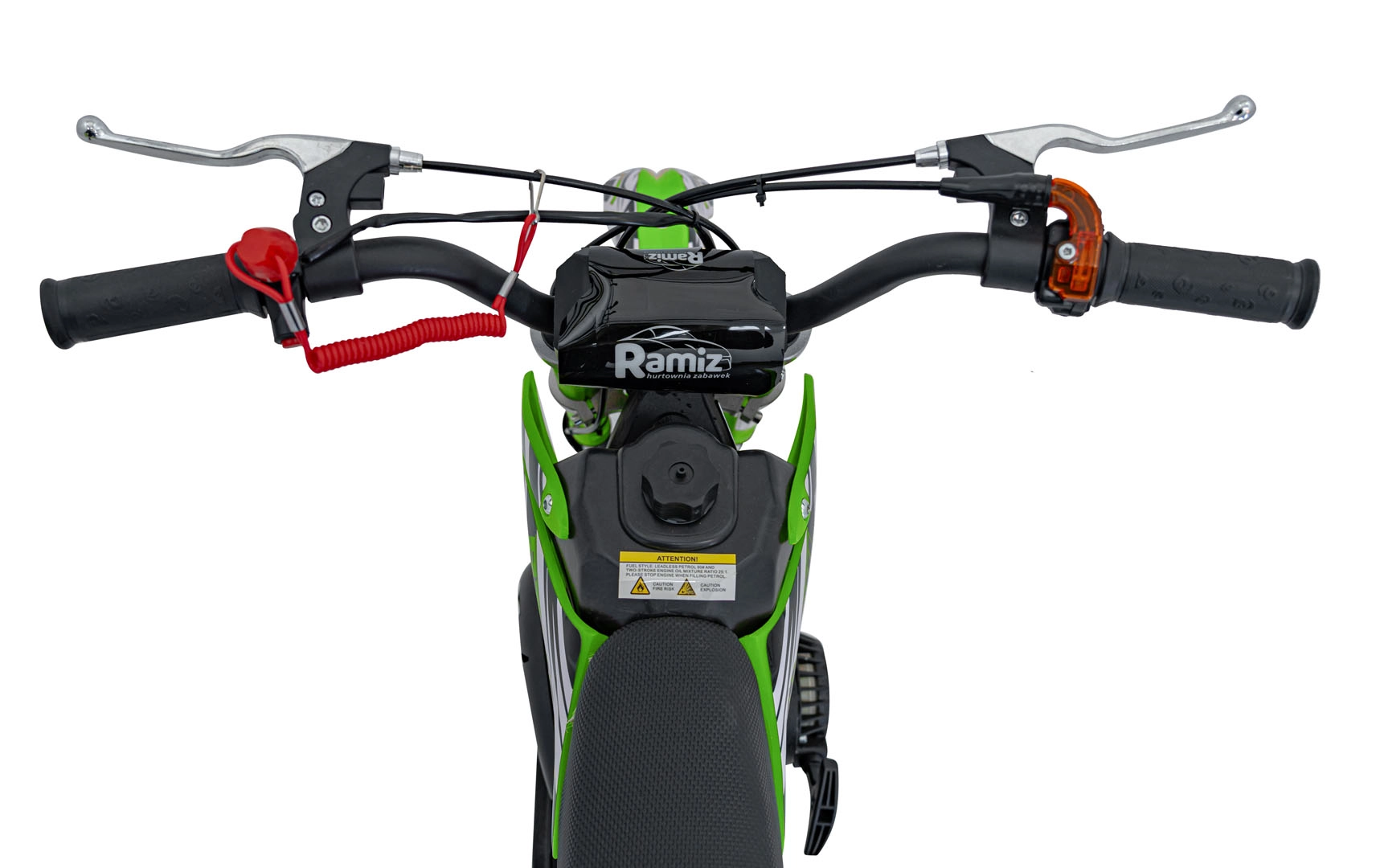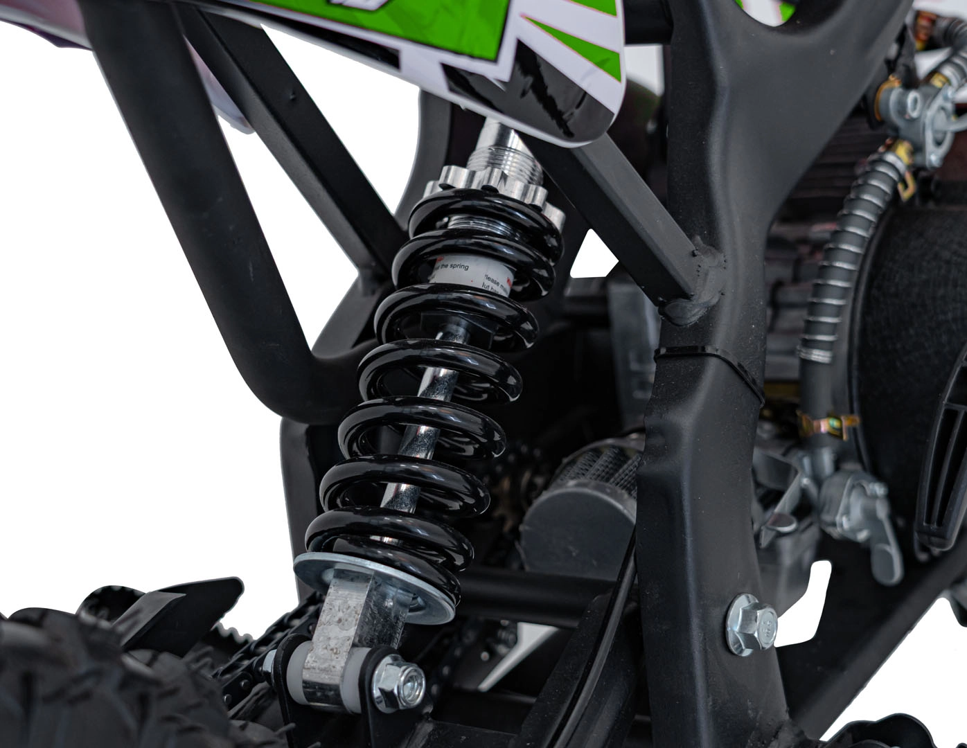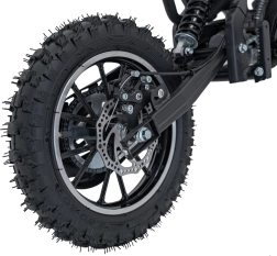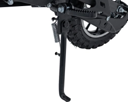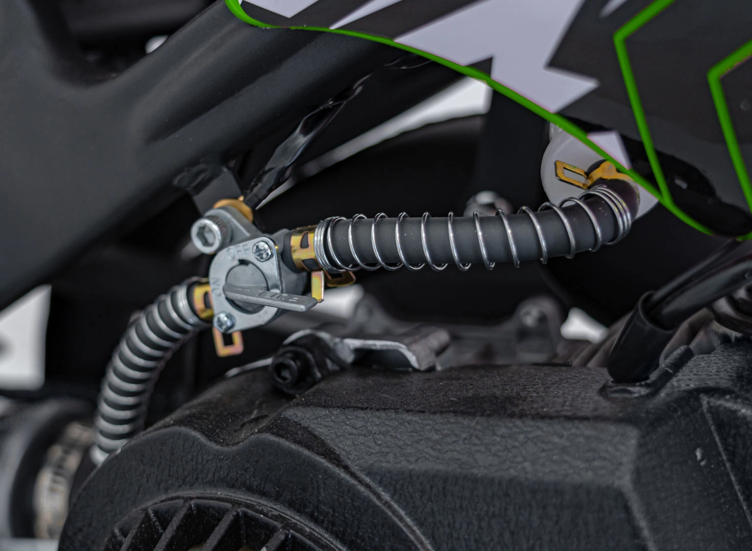 Kompaktný benzínový mini motocykel STORM s motorom 49 ccm ponúka skvelú zábavu pre začiatočníkov aj pokročilých. Má pevný oceľový rám s práškovou povrchovou úpravou, kotúčové brzdy vpredu aj vzadu, teleskopickú vidlicu a nafukovacie pneumatiky s hlbokým dezénom pre istý záber v teréne. Štartovanie je ručným štartérom a bezpečnosť zvyšuje bezpečnostná trhacia šnúra pre okamžité vypnutie.