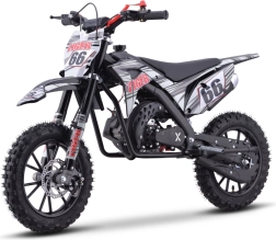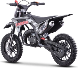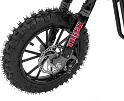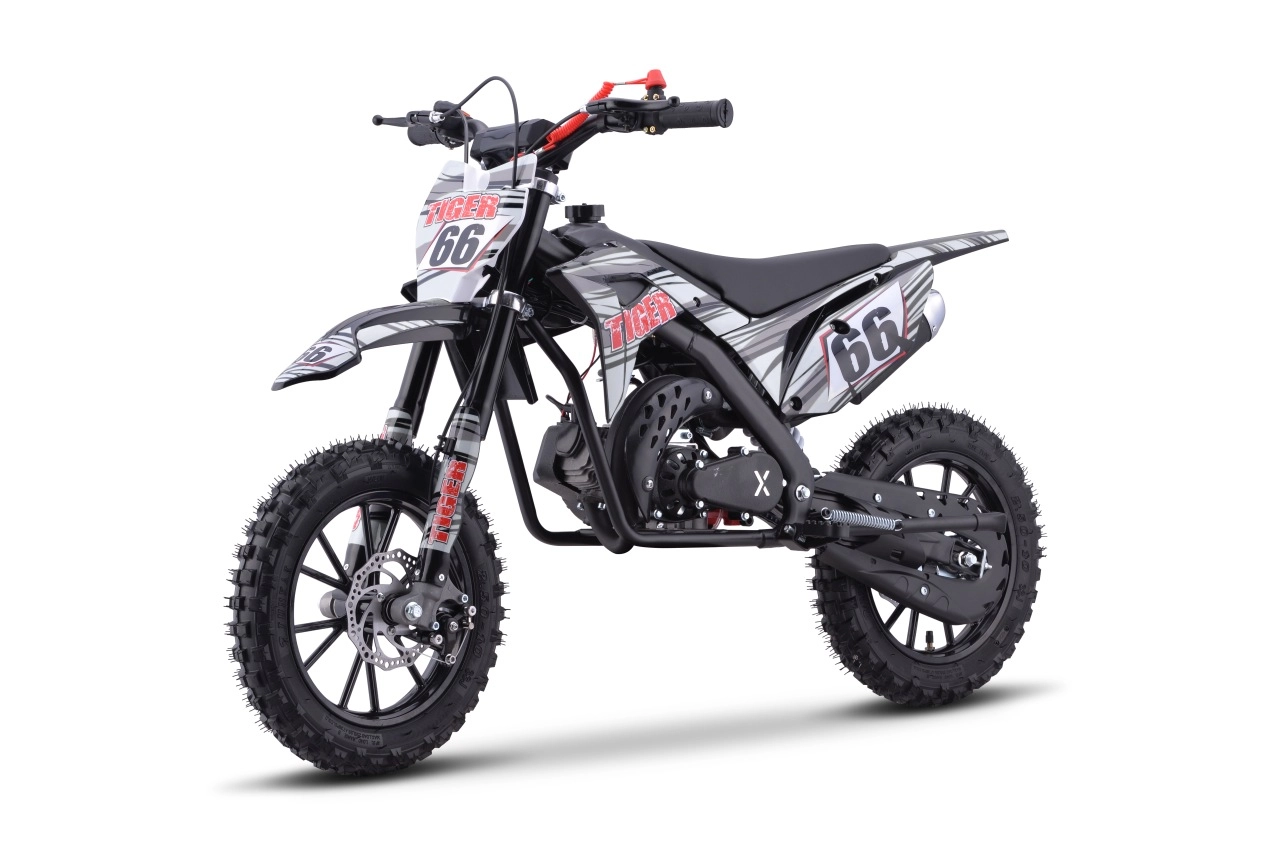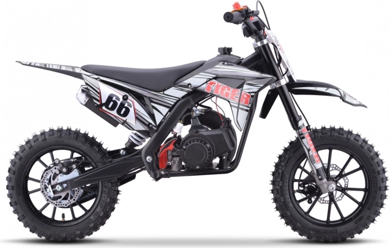 Model TIGER je ideálnou voľbou pre začínajúcich jazdcov aj rekreačnú zábavu. Ľahká a odolná konštrukcia s kvalitnými pružnými plastmi, výkonný dvojtaktný jednovalcový motor 49 cm³ chladený vzduchom a reťazový pohon tvoria spoľahlivý celok pre dynamickú jazdu. Kužeľový vzduchový filter zlepšuje „dýchanie“ motora a plynulý chod.