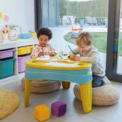 Nasaditeľné veko behom chvíľky vytvorí rovnú plochu na kreslenie a chráni obsah stolíka pred nečistotami. Vstavané výrezy držia ceruzky a drobnosti na mieste.