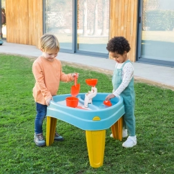 Konštrukcia so silnejšími nohami zaisťuje vysokú stabilitu, zaoblené hrany zas bezpečné používanie aj pre najmenších. Kvalitný plast s UV ochranou udrží sýte farby po dlhý čas. V balení nájdete tiež 5 užitočných doplnkov na kopanie, naberanie a vodné experimenty.