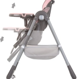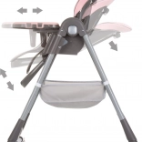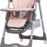 Praktická a pohodlná jedálenská stolička pre deti do 15 kg s nadštandardnou výbavou pre bezpečné a pokojné stolovanie. Ponúka 4 polohy operadla chrbta, 7 výškových pozícií sedadla, nastaviteľnú opierku nôh a mäkkú ECO kožu pre jednoduchú údržbu. O bezpečie sa starajú 5-bodové pásy a stabilná konštrukcia s kolieskami na jednoduché presúvanie. Súčasťou je dvojitý podnos, hrazdička s hračkami a úložný kôš.