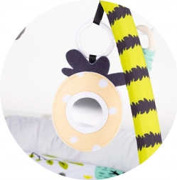 Interaktívna zóna s plyšovými hračkami, hrkálkami a zrkadielkom motivuje bábätko na naťahovanie, uchopovanie a sledovanie, čím posilňuje koordináciu aj zrakové vnímanie.