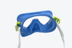 Modrá potápačská maska je vybavená UV ochrannými šošovkami a nastaviteľným silikónovým pásikom, ktorý zaisťuje pohodlie a bezpečnosť pod vodou.