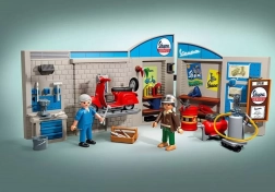 Garáž Vespa zo 60. rokov od PLAYMOBIL je skvelo vybavený set s mnohými doplnkami. Obsahuje pohyblivý zdvihák a miesto pre Vespu. Pneumatiky na Vespe je možné ľahko odňať na výmenu. Rôzne sedadlá umožňujú meniť vzhľad Vespy.