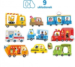 V sade nájdete rôzne známe vozidlá – sanitku, taxi, smetiarske auto, hasičov, odťahové vozidlo, električku a ďalšie. Unikátny prvok: dieliky s postavičkami možno medzi jednotlivými skladačkami ľubovoľne presúvať a vytvárať tak nové príbehy a situácie.