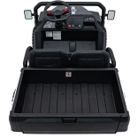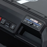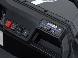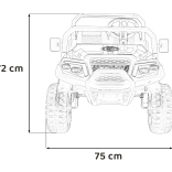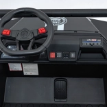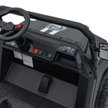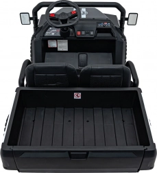 Interiér poteší dvoma samostatnými sedadlami z eko kože s bezpečnostnými pásmi, funkčným audiopanelom (FM rádio, MP3, Bluetooth, USB) aj ovládacími prvkami na volante. Pre väčšiu istotu rodičov je k dispozícii diaľkový ovládač 2,4 GHz s tromi rýchlosťami a okamžitým tlačidlom STOP. Veľký zadný kufor s výklopným čelom odvezie všetko potrebné na vaše výpravy.