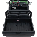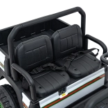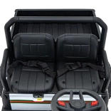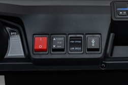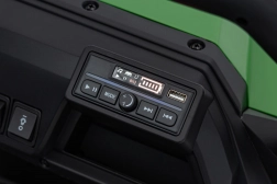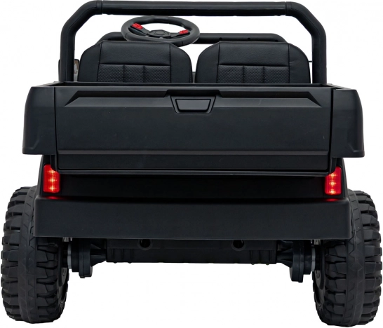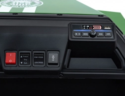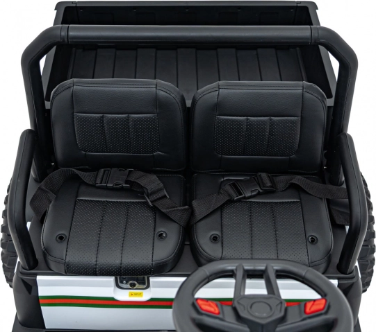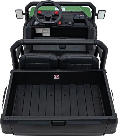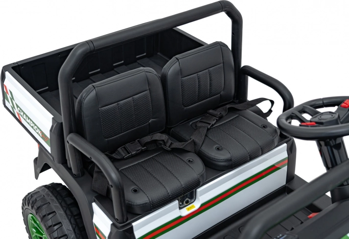 Interiér poteší dvoma sedadlami z ekokože s pásmi, volantom s klaksonom a ovládaním zvukov a praktickým nákladovým priestorom s otvárateľnou burtou na prevážanie hračiek. Audio panel prináša Bluetooth, USB, MP3 a FM rádio, takže obľúbené pesničky budú vždy poruke. Stav batérie stráži ukazovateľ nabitia.