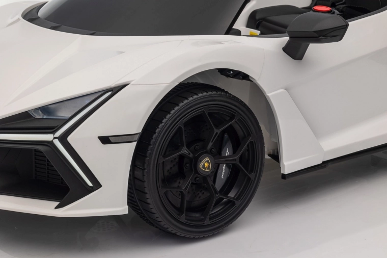 Štýlové detské elektrické autíčko LAMBORGHINI Revuelto v bielej farbe prináša realistický zážitok z jazdy. Ponúka 4×35 W motory, výkonný akumulátor 12 V 9 Ah, mäkké EVA kolesá, otváracie dvere, sedadlo z koženky s bezpečnostnými pásmi a bohatý audio panel s Bluetooth/MP3/USB/FM. Rodičia ocenia diaľkové ovládanie 2,4 GHz s tlačidlom núdzového zastavenia a plynulý soft start pre bezpečnú jazdu vpred aj vzad.
