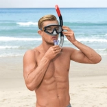 Ortodonticky tvarovaný náustok z mäkkého materiálu znižuje tlak na čeľusť. Nastaviteľný remienok a klip k šnorchlu udržia výbavu pevne na mieste.