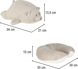 Tento praktický cestovný vankúš 2v1 je ideálny pre deti aj dospelých, ktorí hľadajú pohodlie pri cestovaní. Vankúš sa ľahko premieňa na plyšového medvedíka, s ktorým je radosť maznať sa. Ponúka skvelú podporu krku a hlavy vďaka ergonomickému tvaru a ľahkej výplni z polystyrénových guličiek.