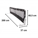 Dĺžka 200 cm a ochranná časť 195 cm poskytujú veľkú plochu zabezpečenia. Odolné materiály – kov, plast a polyester – zaisťujú stabilitu každú noc.