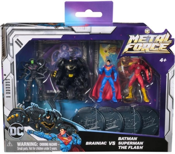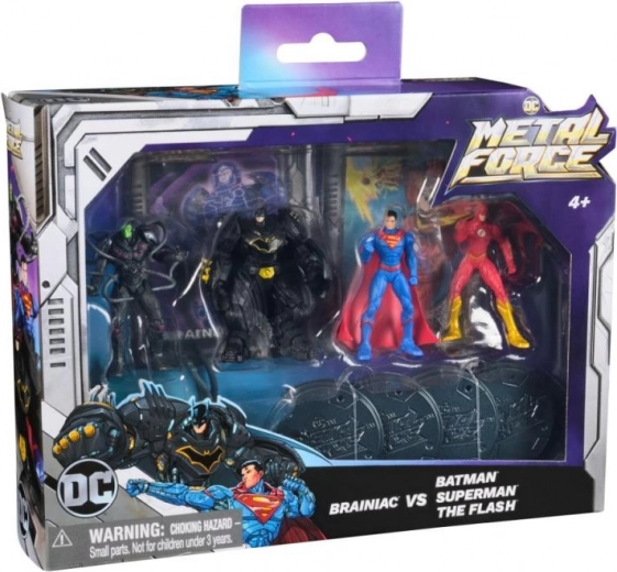 Brainiac, Batman, Superman a Flash v praktickej výške cca 5 cm s detailným spracovaním a metalickým efektom – pripravené na vystavenie aj hranie.