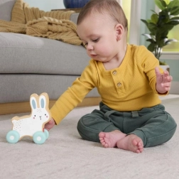 Tento pôvabný zajačik na kolieskach inšpiruje najmenších k aktívnej hre – od prvých dotykov a postrkovania pri sedení až po lezenie a prenasledovanie hračky po podlahe. Kompaktný tvar skvelo padne do malých rúčok a plynulá jazda podporuje koordináciu pohybov a prirodzenú zvedavosť.