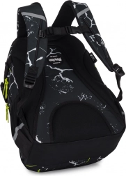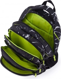Elegantný vzhľad batohu s bielymi abstraktnými vzormi a zelenými detailmi zaujme každého žiaka.