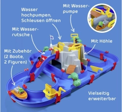 AquaPlay MountainLake je veľká a premyslená vodná dráha pre deti od 3 rokov, ktorá spája kreatívnu hru s poznávaním fyzikálnych javov. Deti môžu naplniť horské jazierka cez vežový poklop, preplávať jaskynným tunelom a zísť vodopádom. Vďaka kľučke so širokými lopatkami ľahko vytvoríte vodné prúdy, ktoré vedú lode kanálmi a cez zdvihadlá.