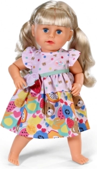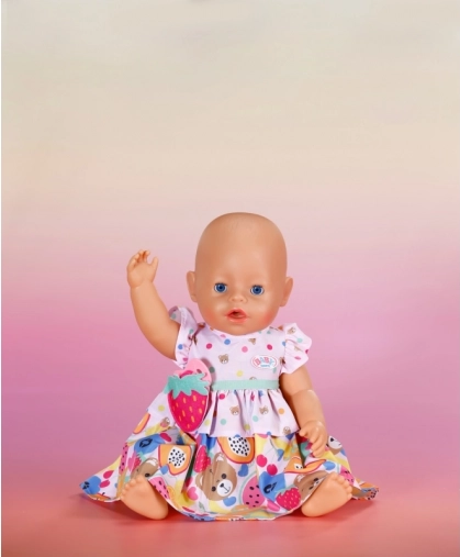 Farebné šaty BABY born s ovocnou potlačou pre bábiky 43 cm. Volániky, opasok s jahôdkou a ramienko z recyklovaného materiálu. Hravé a kvalitné.