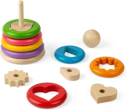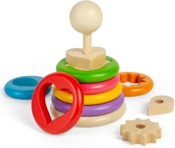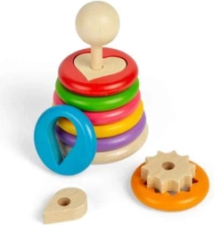 Táto originálna skladacia hračka prináša sedem drevených krúžkov, z ktorých každý ukrýva iný tvar – napríklad srdce, hviezdu, list či ozubené koliesko. Deti najprv priradia správny tvar do krúžku a potom celý dielik navlečú na drevenú tyč. Zábavná cesta, ako pochopiť tvary, veľkosti a priestorové vnímanie.