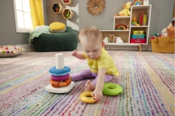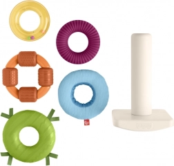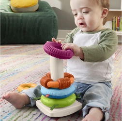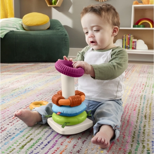 Senzorická skladacia pyramída Fisher-Price je moderná verzia klasickej hračky s kolísavou základňou a piatimi krúžkami rôznych veľkostí. Každý krúžok ponúka iný hmatový zážitok – od mäkkých materiálov cez výrazné štruktúry až po koráliky, ktoré hrkajú. Deti si rozvíjajú zručnosť prirodzenou hrou: uchopujú, pretrepávajú, triedia a skladajú.