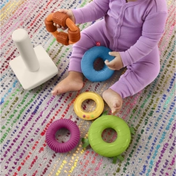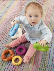 Každý krúžok prináša iné podnety: stužky, mäkký materiál, výrazné drážky, rozličné textúry a hrkajúce koráliky. Deti si užijú chytanie, stláčanie aj pretrepávanie.