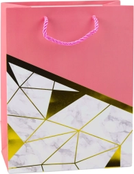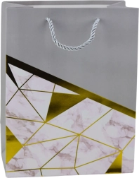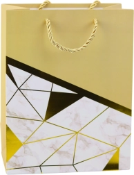 Elegantná darčeková taška s moderným dizajnom je dokonalou voľbou pre každú príležitosť – od narodenín a výročia po svadby a spoločenské udalosti. Vyrobená z kvalitného ozdobného kartónu, vyniká štýlovou kombináciou geometrických vzorov s mramorovým efektom a zlatými líniami. Tieto metalické zlaté línie pridávajú luxusný charakter a robia z tašky elegantné darčekové balenie.