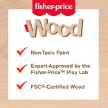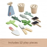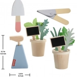 Drevený záhradný set pre deti obsahuje 12 dielov, čo zahŕňa: 2 kvetináče s drevenými listami a rastlinami, lyžicu na hranie, nožnice na hranie, fľaštičku s rozprašovačom a 2 tabuľky pre popis rastlín. Výrobok je vyrobený z dreva certifikovaného Forest Stewardship Council (FSC-N004566) a je zdobený netoxickými farbami na vodnej báze.