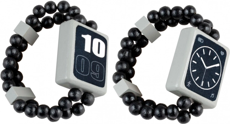 Doprajte deťom kreatívnu hru aj nenápadné učenie sa času s drevenými obojstrannými hodinkami. Jedna strana zobrazuje digitálny čas, druhá analógový ciferník s ručičkami – ideálna pomôcka na prvú orientáciu v čase. Ľahká drevená konštrukcia a pružný korálkový remienok zaručujú pohodlné nosenie aj jednoduché nasadzovanie bez spon.