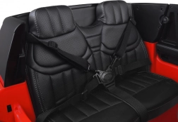 Interiér poteší čalúneným sedadlom z eko kože, 5-bodovými pásmi a prehľadnou palubnou doskou s voliči smeru jazdy vpred/vzad a prepínačom náhonu 2x4/4x4. Farebný multimediálny displej prehrá pesničky aj videá (MP4) z USB či SD karty, nechýba Bluetooth, rádio a dotykové ovládanie.