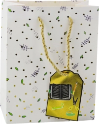 Táto darčeková taška spája elegantný dizajn a praktickú odolnosť. Jemné bodky, kvetinové a listové vzory dopĺňajú lesklé zlaté detaily a priložený štítok s motívmi kníh, kalkulačky či maliarskej palety. Vďaka rozmerom 32 × 26 × 12 cm pohodlne pojme malé až stredne veľké dary.