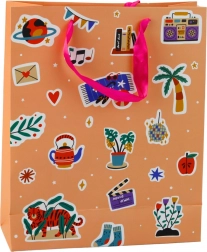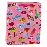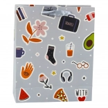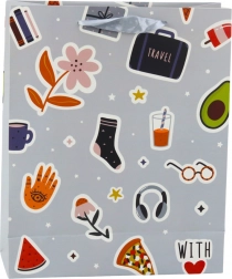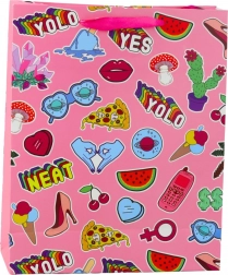 Originálna darčeková taška s potlačou farebných samolepiek a módnych nápisov zaujme na prvý pohľad. Živé farby a trendový dizajn z nej robia skvelý doplnok k darom pre mladých aj dospelých. Vďaka rozmerom 32 × 26 × 12 cm pohodlne pojme menšie aj stredne veľké dary.