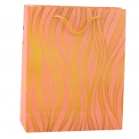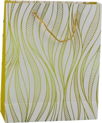 Táto štýlová darčeková taška vyniká elegantným zlatým motívom vĺn na farebnom podklade a pevnou konštrukciou, ktorá spoľahlivo unesie aj ťažšie prekvapenia. Ladiace šnúrkové ušká zaisťujú pohodlné a bezpečné prenášanie.