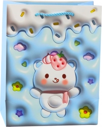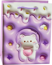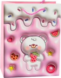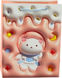 Táto darčeková taška z ozdobného kartónu očarí pastelovou paletou v ružovej, modrej, oranžovej a fialovej. Roztomilý medvedík s hviezdičkami a ovocnými detailmi vytvára 3D efekt, ktorý pôsobí, akoby medvedík vystupoval z tašky. Štýlový vzhľad dopĺňajú farebne zladené šnúrkové uši pre pohodlné a bezpečné nosenie.