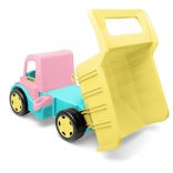 Žltá vyklápacia korba s praktickým madlom umožňuje ľahko nakladať a vysýpať piesok, kocky či iné poklady.