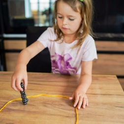 Flexibilná šnúrka rýchlo vytvorí „ihrisko“ kdekoľvek. Vďaka nej je hra prehľadná na stole aj na cestách.