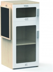 Drevená chladnička Viga je ideálnym doplnkom do detského herného kútika, ktorý rozvíja predstavivosť a kreativitu detí. Chladnička má dve komory - mrazničku a chladničku - a na dverách tabuľu na kriedu pre písanie zoznamov alebo kreslenie.