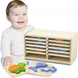 Úlohou dieťaťa je správne umiestniť farebné kúsky puzzle na príslušnú dosku. Jednoduché tvary, krásne obrázky a príťažlivé farby upútajú pozornosť detí a pomôžu im rozvíjať zručnosti skladačky. Súčasťou sady je aj drevený stojan na uloženie dosiek.