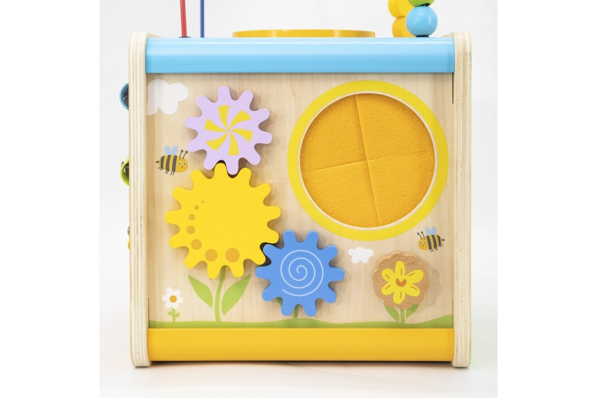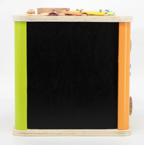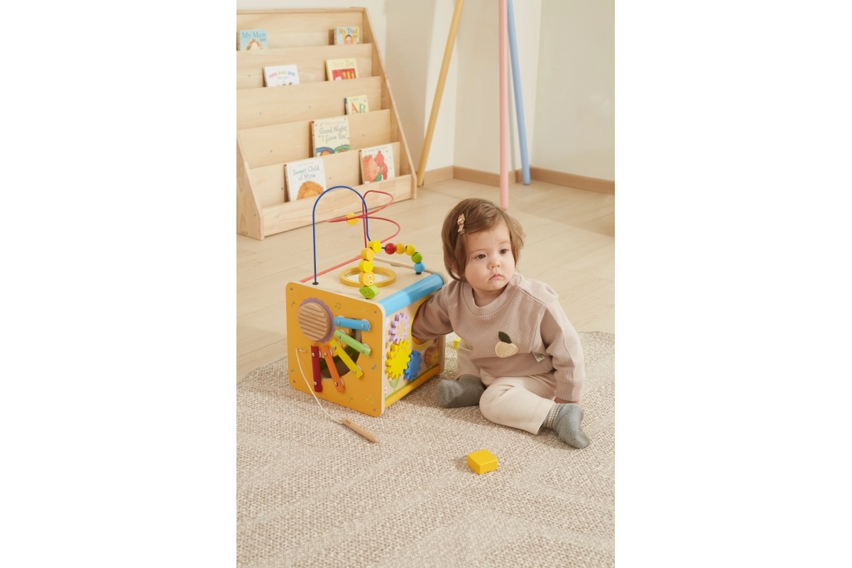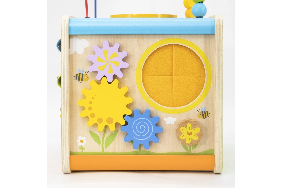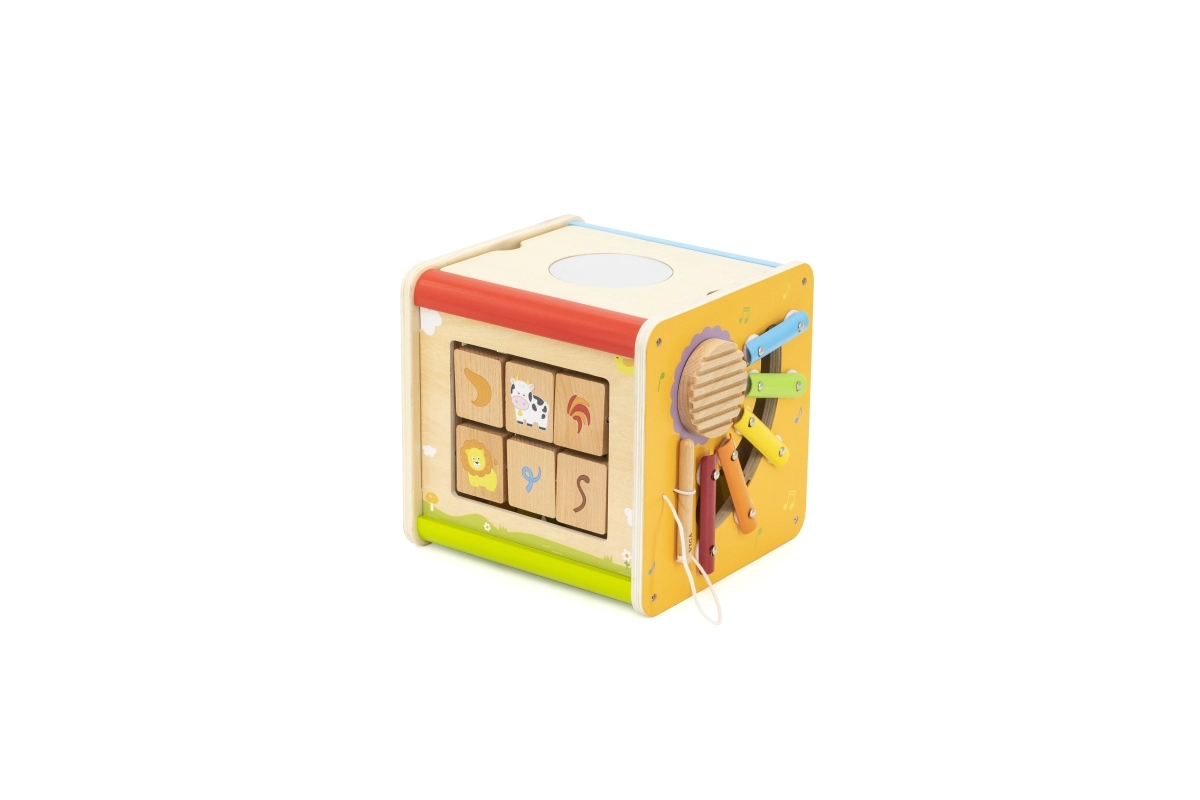 Táto multifunkčná kocka prináša deťom pestrú zmyslovú a motorickú stimuláciu v kompaktnom prevedení. Každá strana ponúka inú aktivitu, ktorá rozvíja zručnosti hrou – od rozpoznávania tvarov a farieb cez rytmus a zvuky až po prvé zoznamovanie s časom.