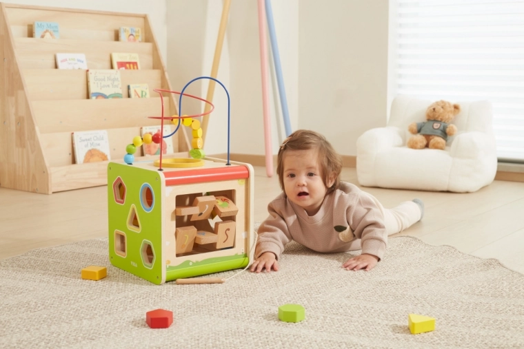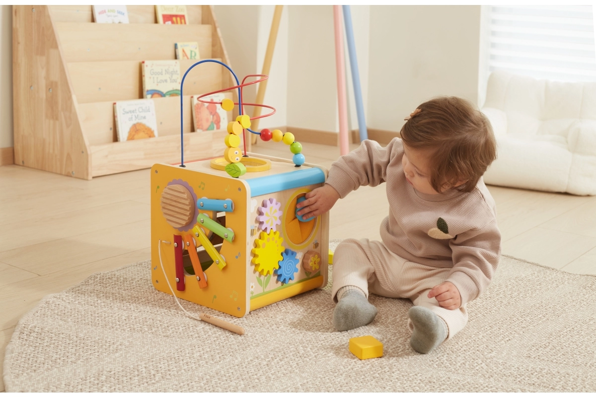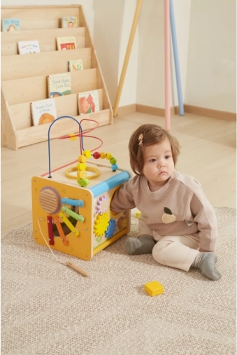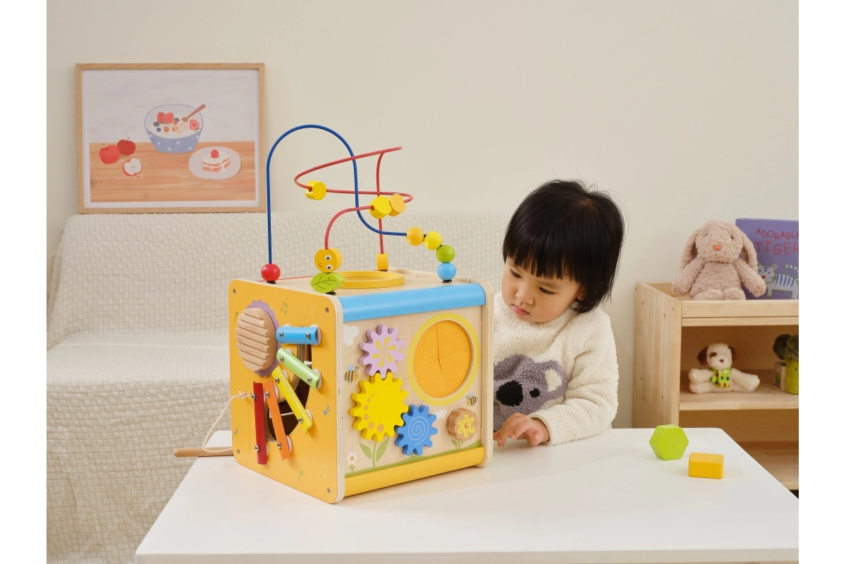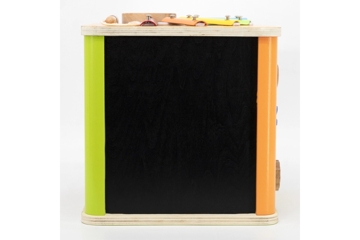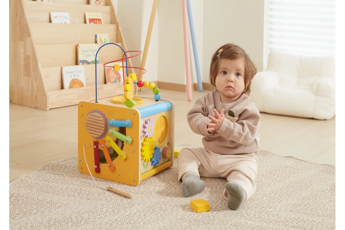 Táto multifunkčná kocka prináša deťom pestrú zmyslovú a motorickú stimuláciu v kompaktnom prevedení. Každá strana ponúka inú aktivitu, ktorá rozvíja zručnosti hrou – od rozpoznávania tvarov a farieb cez rytmus a zvuky až po prvé zoznamovanie s časom.