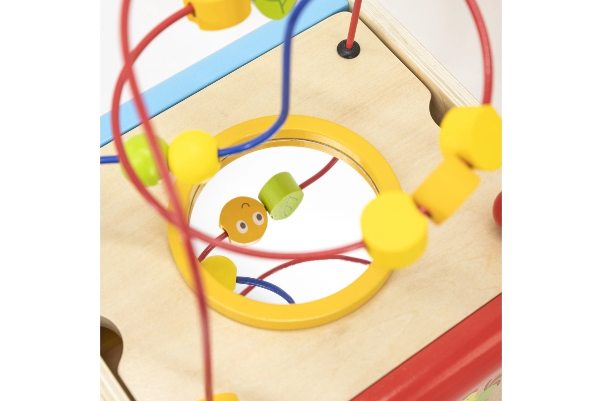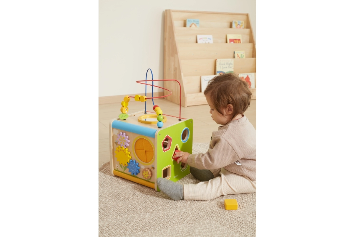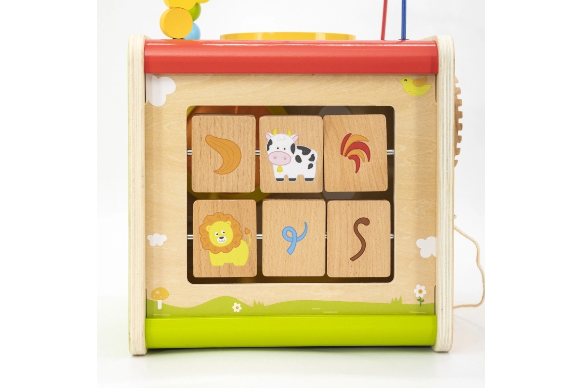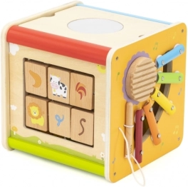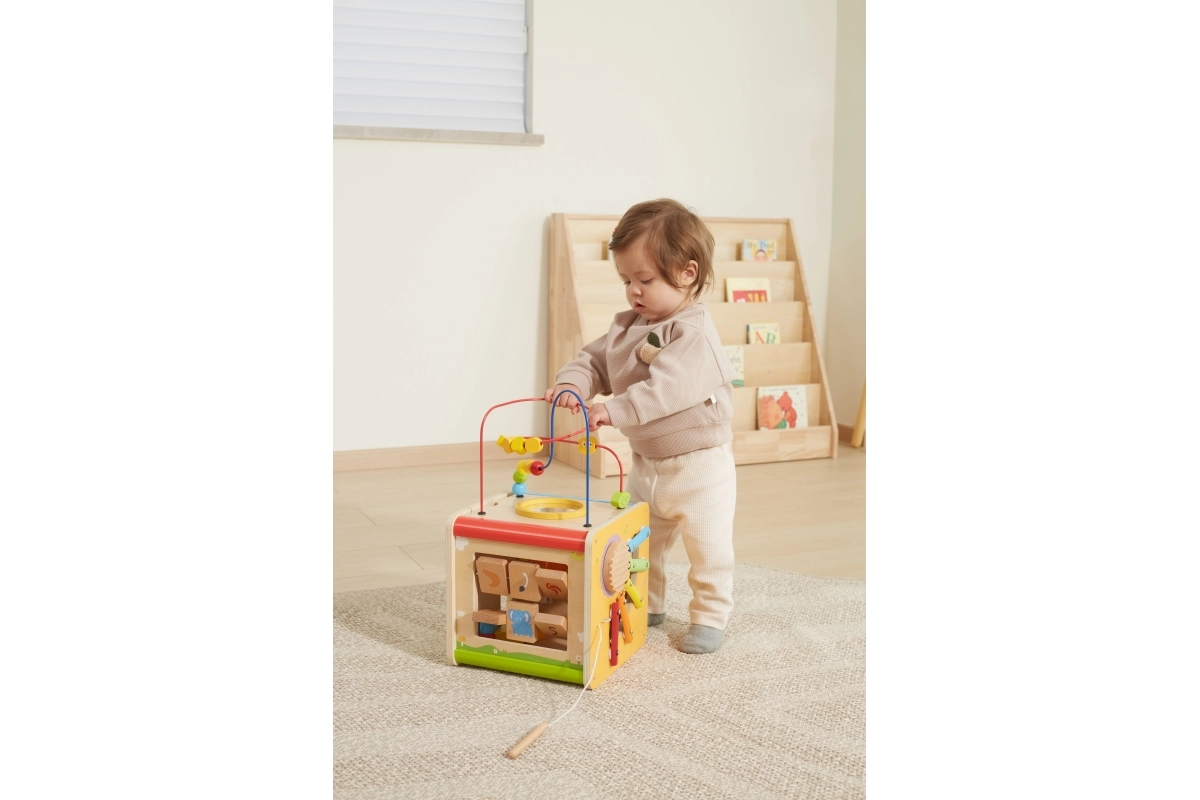 Masívne drevo a hladko opracované hrany zabezpečujú bezpečné používanie, zatiaľ čo sýte farby a zábavné mechanizmy udržia pozornosť malých objaviteľov na dlhý čas. Kocka je skvelá na samostatnú hru aj spoločné chvíle s rodičmi.