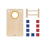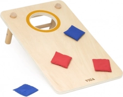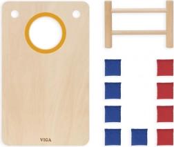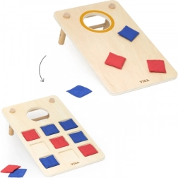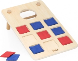 Zábavná drevená hádzacia hra 2v1 od značky VIGA kombinuje klasický cornhole a piškvorky s krúžkami. Vďaka pevnej drevenej konštrukcii, šikmým nohám a látkovým vrecúškam v červenej a modrej farbe ponúka rodinnú zábavu, rozvíja koordináciu ruka-oko, trénuje presnosť hodu a podporuje strategické myslenie pri hraní piškvoriek.