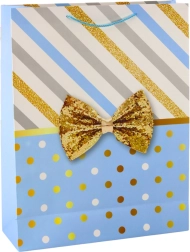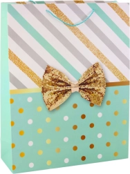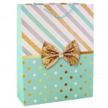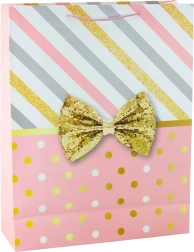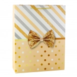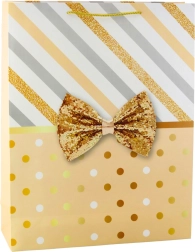 Veľká darčeková taška s unikátnym dizajnom pruhov a bodiek v zlatej farbe, doplnená ozdobnou mašľou.