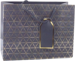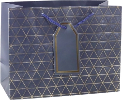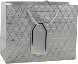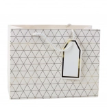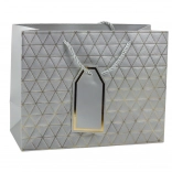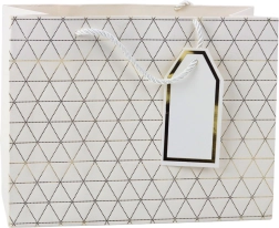 Táto moderná darčeková taška sa pýši geometrickým vzorom v tvare trojuholníkov, zdobených zlatými líniami. K dispozícii je v šiestich elegantných farebných variantoch: biela, modrá, strieborná, červená, sivá a antracitová. Každá taška je vybavená zodpovedajúcim šnúrkovým uchom a príveskom na personalizáciu.