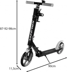 Ľahká mestská kolobežka KRUZZEL so skladacím mechanizmom a veľkými kolesami 200 mm ponúka plynulú a stabilnú jazdu po chodníkoch aj nerovnostiach. Vďaka 3-úrovňovému nastaveniu riadidiel (87–92–98 cm) rastie s dieťaťom, protišmykový nášľap a rukoväte zaisťujú bezpečie a nožná brzda rýchle zastavenie. Súčasťou je bočný stojan, prenášací popruh, držiak na fľašu, zvonček a ďalšie doplnky – ideálne ako darček.
