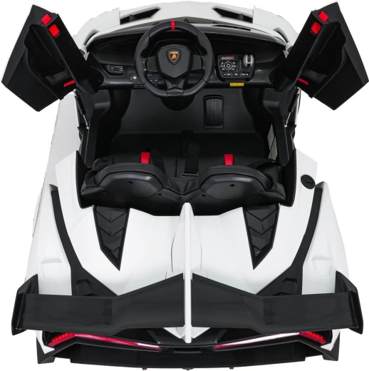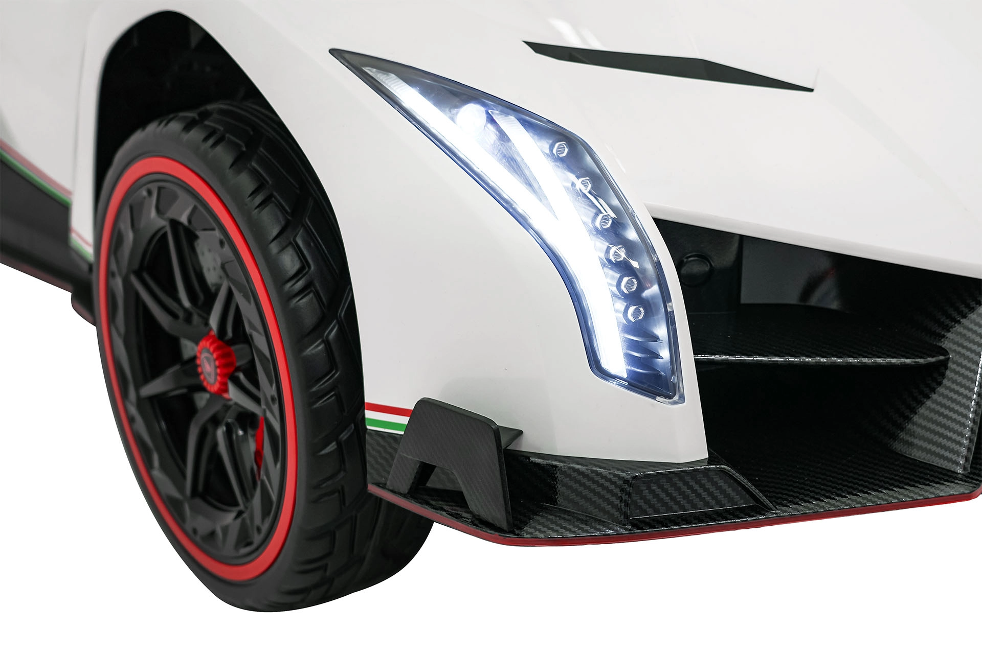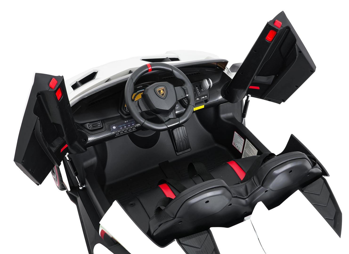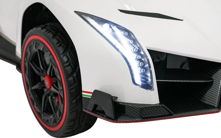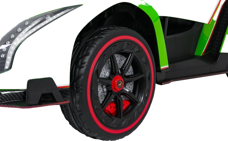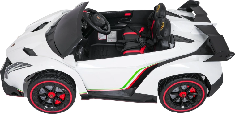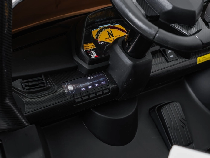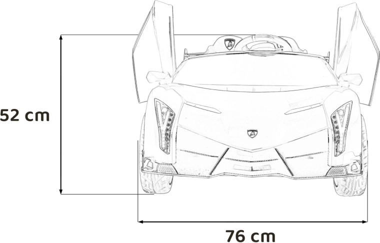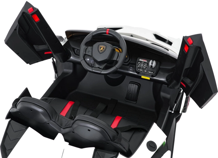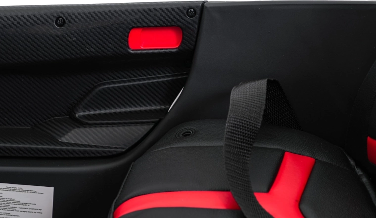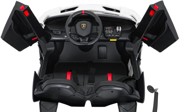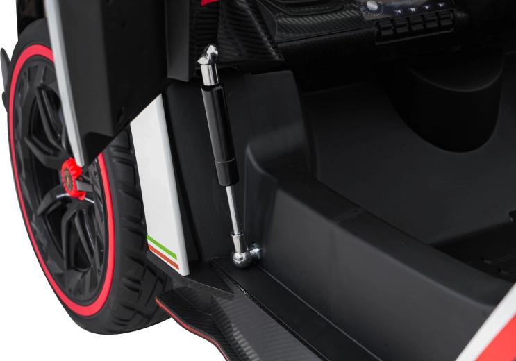 Realistický dizajn umocňujú otváracie nožnicové dvere, funkčné LED svetlá, športové detaily a dvojmiestne sedadlo z eko kože s bezpečnostnými pásmi. Ovládanie je intuitívne z kokpitu (volant, pedál), zároveň možno vozidlo plne riadiť rodičovským ovládačom 2,4 GHz s tlačidlom STOP pre okamžité zastavenie.