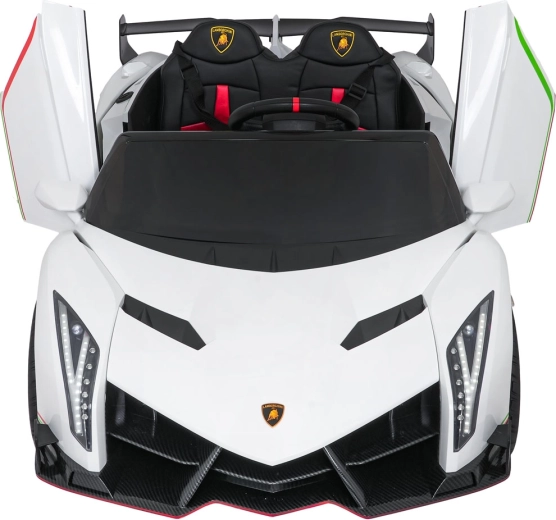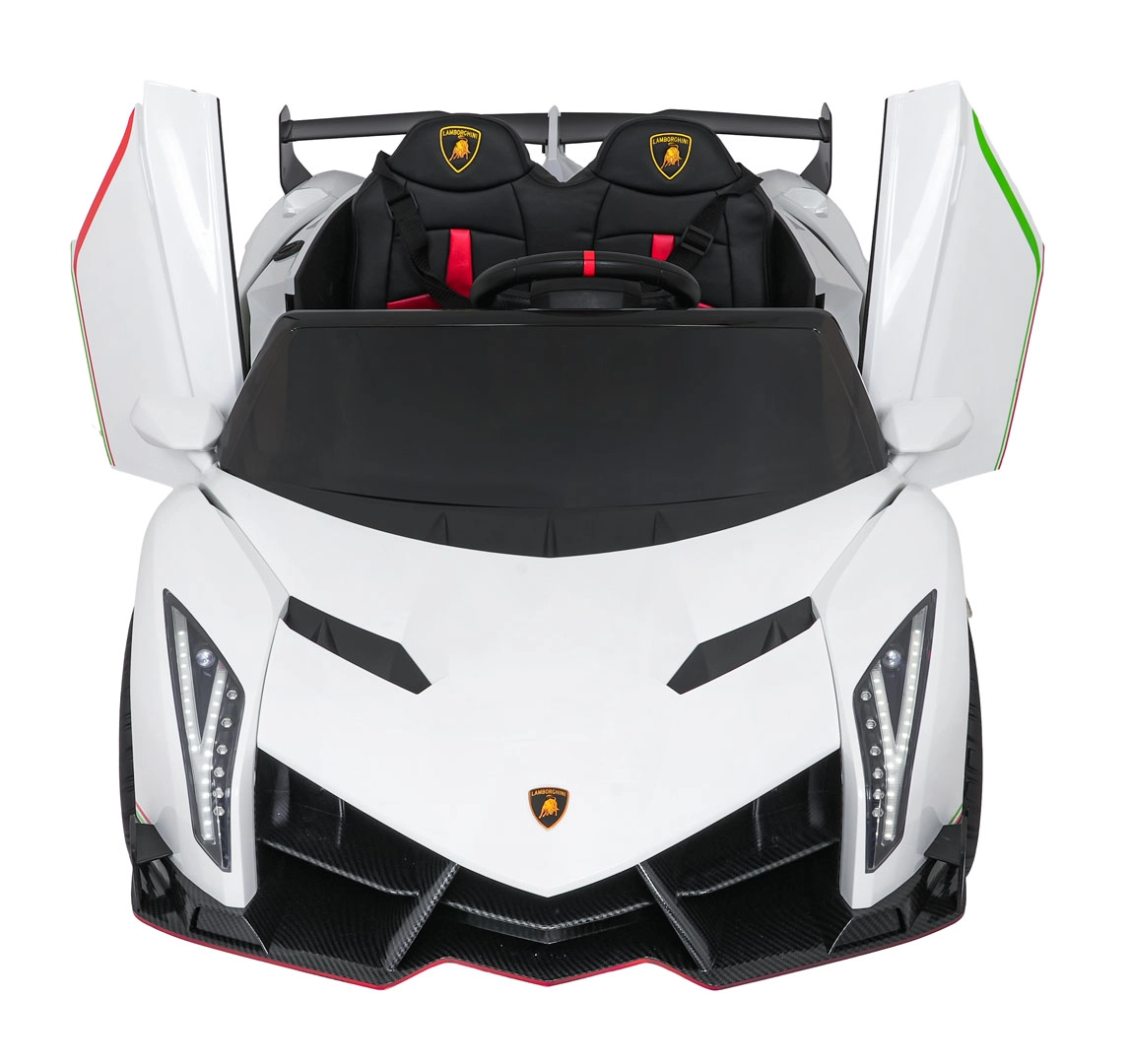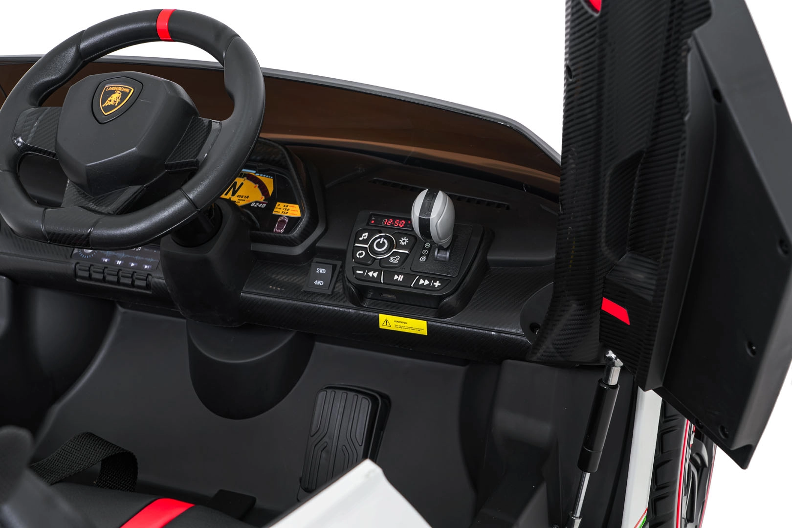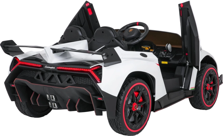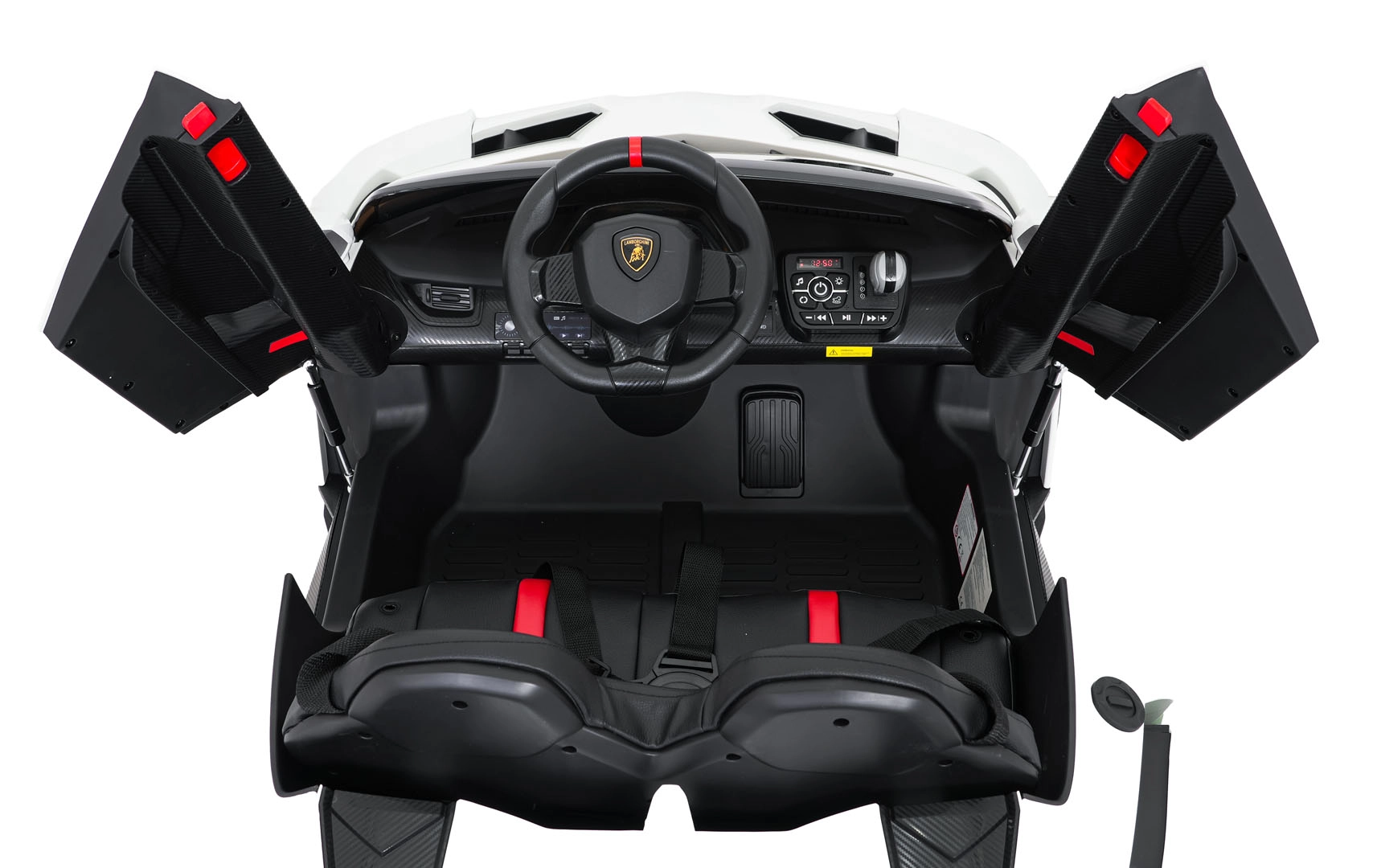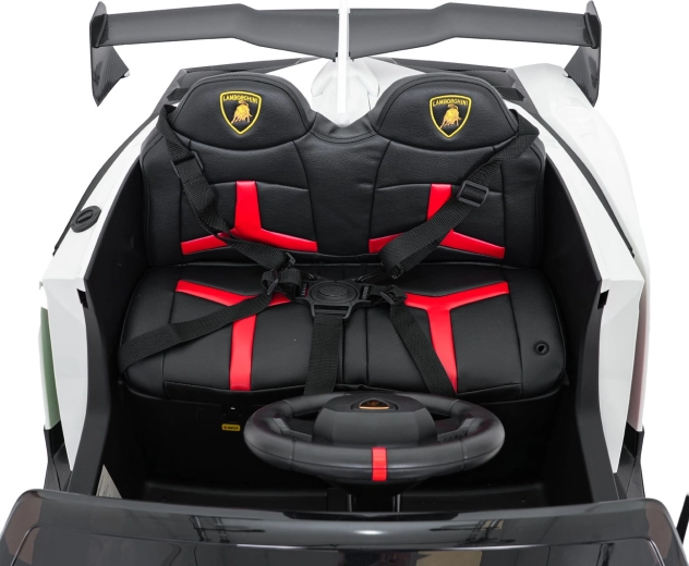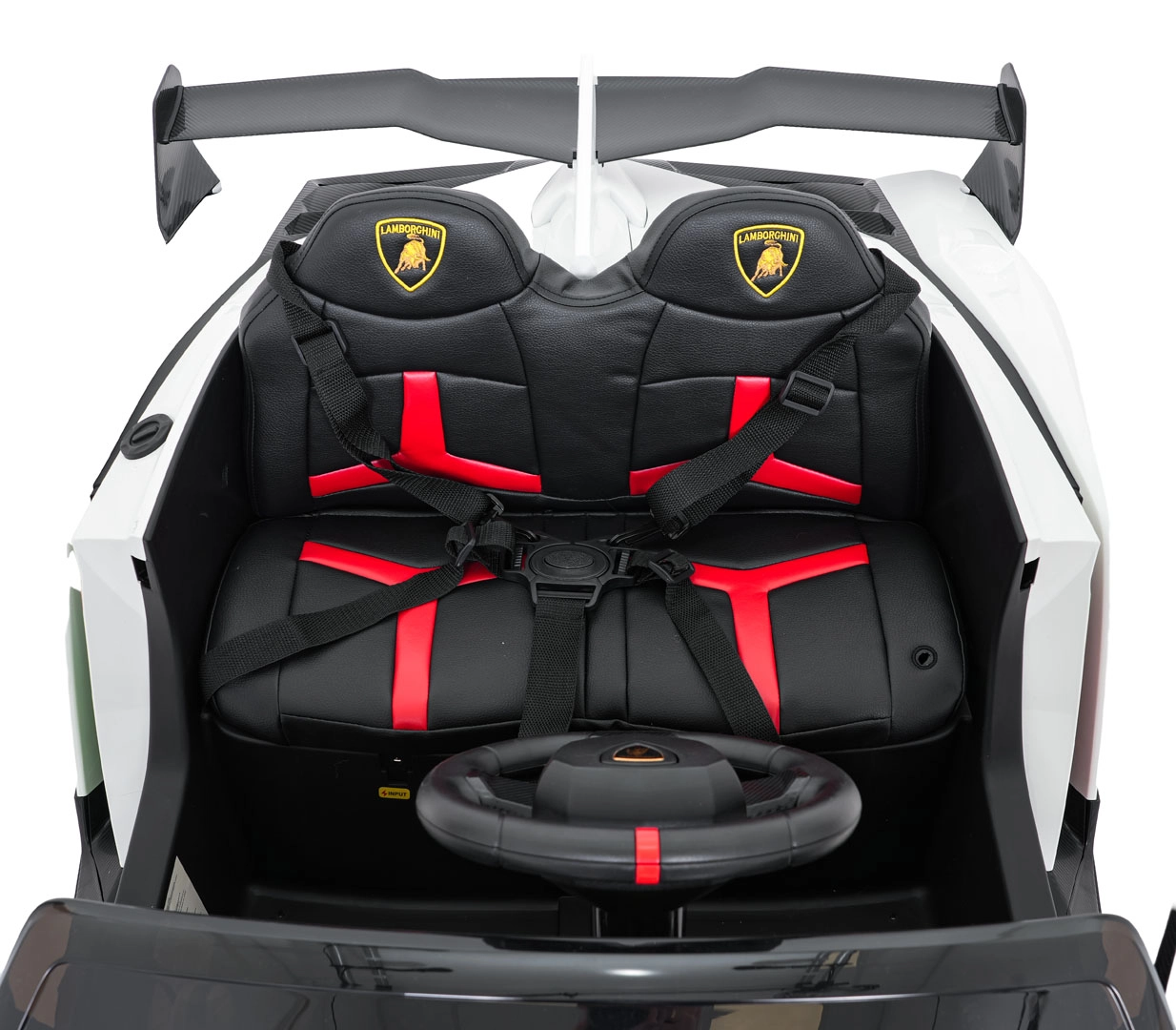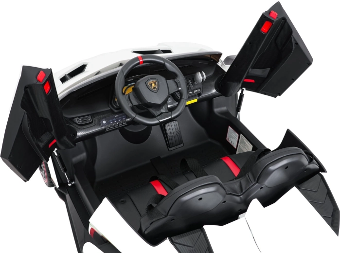 Realistický dizajn umocňujú otváracie nožnicové dvere, funkčné LED svetlá, športové detaily a dvojmiestne sedadlo z eko kože s bezpečnostnými pásmi. Ovládanie je intuitívne z kokpitu (volant, pedál), zároveň možno vozidlo plne riadiť rodičovským ovládačom 2,4 GHz s tlačidlom STOP pre okamžité zastavenie.