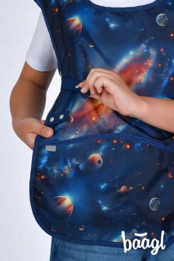 Praktické dvojité vrecká v spodnej časti pojmú štetce, pastelky aj drobné náradie. Vďaka pohodlnému zapínaniu po stranách zástera dobre sedí a neobmedzuje v pohybe. Moderný vesmírny dizajn deti baví a motivuje k tvoreniu.