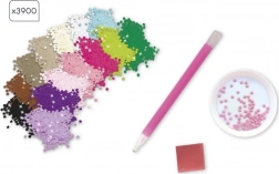- Lepiacie plátno s ochrannou fóliou, cca 1350 kamienkov v 14 farbách, guma, aplikačné pero, návod v brožúre