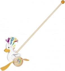 Dúhová kačička Lou je klasická ťahacia/odrážacia hračka na tlačenie, ktorá motivuje deti k pohybu. Vďaka pestrým farbám a hladkému chodu prináša radosť z chôdze a zároveň rozvíja istotu krokov a koordináciu rúk a nôh.