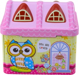 Pokladnička v tvare domčeka s motívom sovy v pastelových farbách osloví každé dieťa.