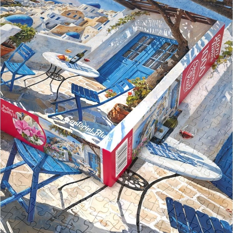 Puzzle „Santorini Blues“ od značky CherryPazzi prináša nádherný pohľad na malebný ostrov Santorini. Obraz zachytáva úzku terasu s kvetmi a úchvatným výhľadom na kalderu a more, čo dokonale vystihuje idylický pôvab stredomorského života. Hladké, čisté línie architektúry odrážajú jasné egejské slnko, zatiaľ čo modré kupoly ladia s farbou mora a oblohy, čím vytvárajú harmonický a výrazný kontrast.